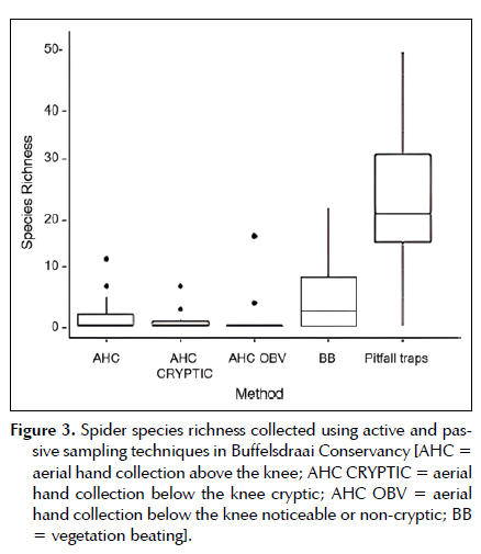 There was a significant difference between bush beating and aerial hand collection above the knee non-cryptic (Table 5). The latter sampling methods seem to have low to no contribution to the variation in mean richness. Pitfall trap comparisons had high significance (p < 0.0001). Therefore, it was surmised that pitfall traps had the most influence on the differing spider richness (Table 5).