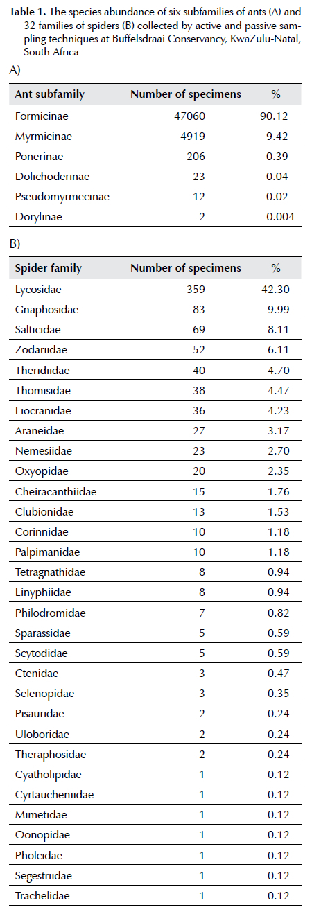 Ant specimens were identified either to species level using voucher specimens in the School of Life Science, University of KwaZulu-Natal (UKZN) in Pietermaritzburg campus or to genus level using Fisher and Bolton (2016) and then assigned to morphospecies by the last author. A voucher collection with representative specimens is currently placed at the School of Life Sciences at UKZN and Iziko Museum of Cape Town. A.S. Dippenaar-Schoeman at the Agricultural Research Council (ARC) identified the spider specimens to species levels where possible or otherwise genus and then morphospecies. All specimens are housed at ARC in Pretoria.