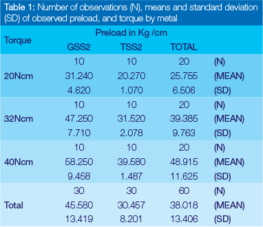 To determine whether there was an inherent difference in the qualities of the different screw types, a final analysis comparing the two screw types with respect to the changes in preload from 20Ncm torque in the first cycle to 40Ncm torque in the tenth cycle was done using an analysis of covariance (ANCOVA) with the value at 20Ncm torque in the first cycle used as baseline covariate. The two metals did not differ significantly with respect to the mean change in preload, adjusted for baseline, (p=0.5159: 18.7 for GSS2 and 16.9 for TSS2).