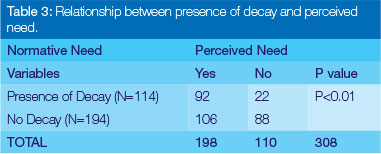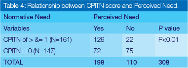 When the normative needs as captured by the oral health examinations were compared with perceived needs as reported by participants, the data indicated that of the (n=198) individuals that responded positively to perceived need, participants without decay had a significantly (p<0.01) higher perception of need than those with decay (Table 3). However, participants who presented with a CPITN of 1 to 4 had a significantly (p<0.01) higher perception of need than those with a zero CPITN score (Table 4).