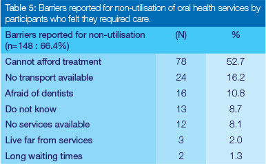 Amongst the participants (n=223: 72.4%) who had not utilised any oral health services, 33.6% felt that they did not require a dentist and hence did not report on any barriers. Therefore (n=148: 66.4%) reported on the barriers indicated in Table 5. The most common barriers reported were the inability to afford dental treatment (n=78: 52.7%) followed by the lack of transport (n=24: 16.2%).
