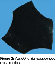The three WaveOne instruments are also characterised by different cross-sectional designs over the entire length of the working part of the instruments. In the tip region the cross-section presents radial lands while in the middle part and near the shaft the cross-sectional diameter changes from a modified triangular/convex cross-section with radial lands to a neutral rake angle with a triangular/convex cross-section (Figure 2).14