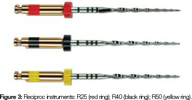 Gavini et al. (2012) evaluated the resistance to flexural fatigue of the Reciproc R25 files under either continuous rotation or reciprocation, using simulated root canals of tempered steel.21 The results showed that the reciprocation motion improves the flexural fatigue resistance of the Reciproc R25 when compared with continuous rotation.