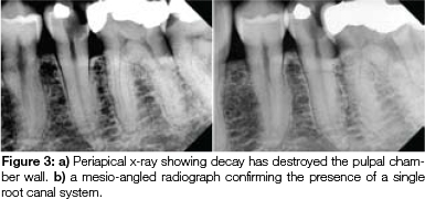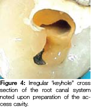 A 66-year old male patient was referred for endodontic treatment and restoration of his lower left second premolar, after he presented with acute irreversible pulpitis and acute apical periodontitis. Radiographic evaluation revealed that the decay had exposed the pulp and that the tooth had a single root canal system (Figure 3a and 3b). An irregular 'keyhole" cross section of the coronal root canal system was observed during access cavity preparation (Figure 4). Working length was determined using the I-pex apex locator (NSK, Nakanishi, Japan) and confirmed with a periapical radiograph (Figure 5). The canal was prepared with the Reciproc R25 (VDW) and, following apical gauging, the canal was enlarged to a 35, 4% taper using the BT3 Race file (FKG Dentaire, Switzerland). During instrumentation, the canal was irrigated with 3.5% sodium hypochlorite (Jik, Reckert-Benkieser, South Africa). The Endovac (Axis/Sybron, Coppel, Texas) apical negative pressure irrigation system was used to optimise the volume of irrigant delivered through the root canal system. Ultracal (Ultradent, Utah, USA), a non-setting calcium hydroxide was used as an inter-appointment medicament in the root canal.