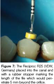 At the second visit, the medicament was removed and the irrigation regime as above was resumed. An additional final rinse of a 17% EDTA and cetrimide combination (Smear Clear, Axis/Sybron, Coppel, Texas) was used to remove the smear layer. A size 35, 4% tapered gutta-percha cone (Diadent, Korea) was tested for fit and tug back confirmed. A "cone fit" radiograph was taken to confirm the seating of the gutta-percha cone (Figure 6), The Reciproc FÍ25 file (VDW, Germany) was seated to the orifice and a rubber stopper used to mark the depth (Figure 7). The stopper was then adjusted to a depth of 5mm beyond the level of the orifice.