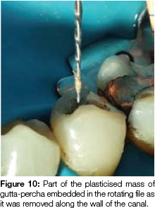 It is important to confirm tug back of the gutta-percha cone and to use a minimal amount of root canal sealer, as this will reduce the incidence of sealer extrusion through the apex, a drawback of the technique. This is important when the apical foramen is close to anatomical structures such as the mental foramen, the inferior alveolar nerve and the floor of the maxillary sinus. In oval or irregular canals the gutta-percha can be laterally condensed before thermo-mechanical compaction, to provide better apical control and reduce inadvertent sealer or gutta-percha extrusion.17 The gutta-percha should be cut at least 3 to 5mm above the level of the orifice. This provides the volume needed for compaction and compensates for the amount that will be embedded in the flutes of the blade (Figure 10). Another important consideration is to remove the file along the outer wall of the canal during compaction, which reduces the volume of gutta-percha removed from the canal. If an excessive amount is removed coronally, an additional piece may be placed in the residual space, softened with the ultrasonic scaler tip and condensed with pluggers. Alternatively the coronal space can be back filled with heat softened gutta-percha. The Reciproc R25 is suitable for thermo-mechanical compaction of gutta-percha for most canals, while the Reciproc R40 can be used in larger canals.