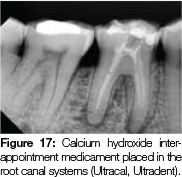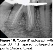 A 56-year old female patient was referred for endodontic treatment of her lower right first molar after she presented with an acute absess. Radiographic examination revealed a fractured restoration, receded pulp chamber and periapical radiolucency (Figure 16). Four canal orifices were found and the canals shaped using the following sequence: Protaper Next X1 (Dentsply/Maillefer) followed by size 25, 4% taper and finally size 30, 4% taper (Flexmaster files, VDW, Germany). The distal canals were confluent. A calcium hydroxide (Ultracal,Ultradent) inter-appointment medicament was used as there was still periapical exudate after shaping (Figure 17). A 3.5% NaOCl irrigant was used, followed by a final rinse with 17% EDTA (Smearclear, Axis/Sybron). Irrigants were agitated by active ultrasonic agitation using a size 15 NSK U-file (NSK, Nakanishi, Japan). The distal pulp horn was cleaned using a precurved 15 U file with ultrasonic agitation. Irrigation through the root canal systemwas further optimised by synchronous use of the Endovac system (Axis/Sybron) with irrigant delivery through a 31 gauge Navitip sideport needle (Ultradent) in the adjacent root canal. Size 30, 4% tapered gutta-percha points (Diadent, Korea) were tried in, confirmed radiographically (Figure 18) and tug back verified. The gutta-percha cones were coated in AH Plus sealer (Dentsply/ Maillefer) and the Reciproc R25 (VDW,Germany) was used for thermo-mechanical compaction as described previously. The core build up was completed and post-operative radiographs revealed a filling of the anastomosis between canal systems in the mesial root and also in the distal root (Figures 19a and b). The patient was referred back to her dentist for an indirect onlay with cuspal coverage.