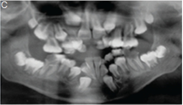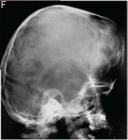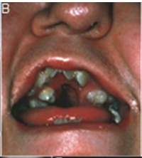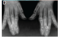 A diagnosis of Apert syndrome was made. Apert syndrome is a rare developmental condition characterized by premature cranial synostosis and resultant growth disturbances. Signs of Apert syndrome include a peaked and vertically elongated head, widespread bulging eyes, and a protuberant frontal region with an anteroposterior ridge overhanging the frontal eminence (Figure A). The palate is high, arched and occasionally cleft (Figure B). There is hypoplasia of the maxilla with relative prognatism of the mandible. Dental malocclusions with crowding and delayed dental eruption in the maxilla are common (Figure C). The facial angle is exaggerated; the nose is small and has been compared to a parrot's beak in appearance. Hypertelorism, exophthalmos and divergent strabismus are often present; sometimes with blindness. Spina bifida has been recorded in some patients. Syndactyly of the hands and feet varies greatly. Hand films in Apert syndrome showing syndactyly with fusion of three fingers in both hands and webbing (Figure D). Syndactyly of the feet in the same patient is also discernible (Figure E) Note the tall (turricephalic) skull, open metopic suture, and faint beaten-silver appearance of the calvarium. Skull base and roof of the calvarium are flattened, with a noticeable beaten-silver appearance (Figure F). The 3-D CT reconstruction of the same patient showing hypoplastic maxilla with posterior cleft (Figure G) The patient may be retarded or of normal intelligence. Apert syndrome may be associated with advanced paternal age. The cardinal radiologic features of Apert syndrome are: Brachycephalic (reduced anteroposterior dimension of the skull with increased skull width). Turricephaly (occurrence of a skull with high vertical index), beaten silver appearance of the calvarium, absence of demonstrable cranial sutures in coronal dimension in young patients, hypoplastic maxilla and syndactyly of the hands and feet. Differential Diagnosis: Crouzon's disease, Pfeifer syndrome, Carpenter syndrome and Summit syndrome.
