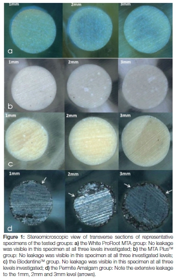 RESULTS: Data for different groups was summarised as percentages. Pairwise comparisons between the calcium silicate materials to amalgam were done at the 0.017 level of significance, using Fisher's exact test. Amalgam showed significantly more leakage than the calcium silicate materials (ProRoot® MTA, MTA PlusTM and Biodenti-neTM) (p<0.001). No significant differences in sealing ability were found among the calcium silicate materials.