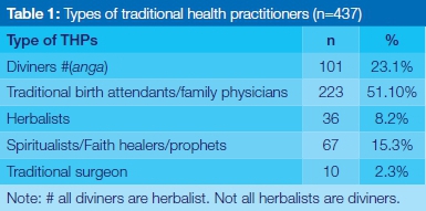 A total of 437 THPs were interviewed. The largest numbers of traditional health practitioners were diviners (23%) and family practitioners (51%). These are traditional healers who perform divination (throwing of bones or ancestral channeling), or who were family protectors (u vhea mui) and birth attendants. There were 36 (8.2%) respondents who used their knowledge of plants, herbs and animal products to cure illnesses. Spiritualists, including the faith healers, prophets and fortune tellers (u femba), accounted for 77 (17.6%) of the sample. There were a few traditional surgeons (2.3%), and all were males, responsible for male circumcisions (Table 1).