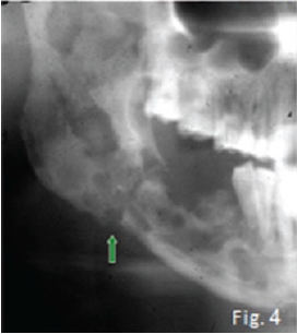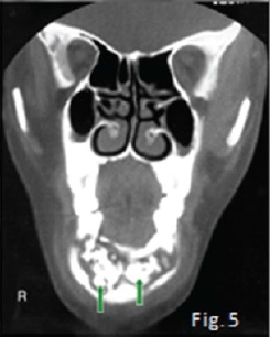 The cropped pantomograph (Fig 2) shows a "blurred/ fussy" appearance of the trabeculae due to loss of density. Signs of cortical destruction are also present. A provisional diagnosis of acute osteomyelitis was made which was confirmed histologically. Osteomyelitis is an inflammation of bone cortex and marrow that develops in the jaw usually after a chronic infection: No detectable radiographic features of the infection are discernible in the first 8-10 days (radiological principle: 30-60% decalcification before any changes are observed). About three weeks after the start of the infection irregular radiolucencies with enlargement of trabecular spaces are noticed (Fig 3). In the chronic stages, extensive areas of the bone may be destroyed and sequestra are formed showing the classic moth-eaten appearance and occasionally a pathological fracture may also be present (Fig. 4). Note the sequestration of bone in the anterior mandible on the coronal CT scan (Fig. 5) of another patient with chronic suppurative osteomyelitis The coronal T2 W. MRI scan (Fig. 6) shows the sequestrated bone (no signal black) is surrounded by zones of high signal intensity (white signal) representing the regions of active inflammation. Most cases of osteomyelitis of the jaw result from odontogenic infections, infections from a fracture site; or, rarely, haematogenous spread from a distant site, which is more common in the long bones. The cause of infection is most frequently Staphylococcus aureus, but haemolytic streptococci and Bacteroides are also encountered. The mandible is by far the most frequently affected; the adult maxilla is very seldom the site of osteomyelitis. The acute phase of suppurative osteomyelitis is sudden in onset and rapid in course. The patient experiences severe pain, fever, regional lymphadenopathy, and leucocytosis. Teeth in the region become loose and tender to percussion. When the mandible is involved there may be paraesthesia of the lower lip on the affected side. As soon as drainage is established, the pain eases, the temperature drops, the patient becomes more comfortable. Without treatment the infection may progress into a protracted chronic suppurative osteomyelitis. Differential diagnoses include malignancies and oteoradionecrosis.