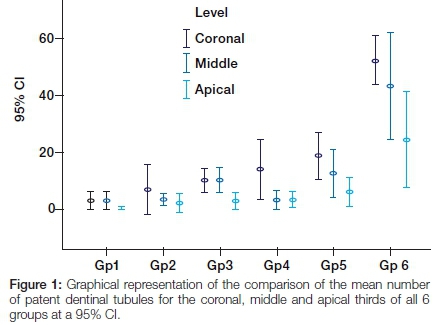The roots were prepared for Scanning Electron Microscopy according to standard methods.24,25 Two photomicrographs were taken per third per tooth. This was done by superimposing a numbered grid over the relevant third and selecting random numbers from a statistical random number table. The selected block was magnified to 2500x. Using Image J software (U.S. National Institutes of Health, Bethesda, Maryland, USA) the open tubules in each photomicrograph were counted independently by two calibrated expert examiners. Partially open and closed tubules were not counted. Open tubules were defined as round, with no smear layer or matter overlying the tubule opening. Bacteria may be present inside the tubule such that a sealer will entomb it when penetrating the canal but may not be covering the opening. Inter-rater reliability was determined using the kappa-test. Where the examiners differed, consensus was reached after discussion. The One-way ANOVA test was used to establish intra-group and inter-group differences. A p-value ≤ 0.05 indicated a significant statistical difference at a 95% confidence interval. The Tukey HSD or Tamhane test was used for multiple comparisons.