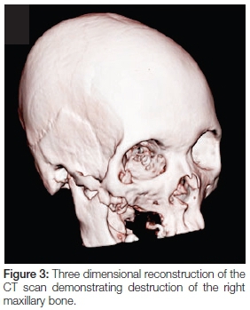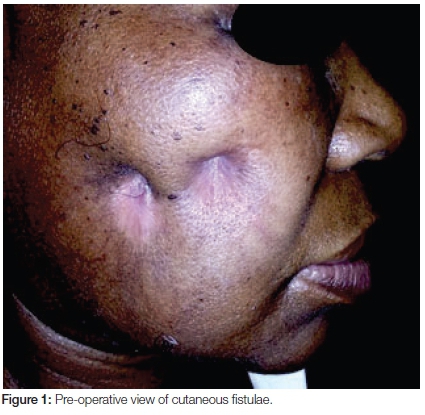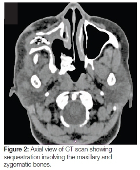 A 55 year old female with a medical history of hypertension and type II diabetes was referred to the Maxillofacial and Oral Surgery Clinic, Grey's Hospital, South Africa. The patient presented with a right unilateral facial swelling with pus discharging through three cutaneous fistulae in the right zygomatico-orbital region, the lesion being of three years duration (Figure 1). The patient had undergone a maxillary sequestrectomy performed three years ago by the Department of Otolaryngology. This was done in an attempt to treat her chronic suppurative sinusitis, which had eroded her maxillary sinus walls and hard palate (Figures 2 & 3). She had received several doses of antibiotics including a Penicillin derivative such as Amoxicillin combined with Clavulanate, an Imidazole such as Fluconazole, a Tetracycline such as Doxycycline and a Nitroimidazole such as Metronidazole on separate occasions spanning the three year period.