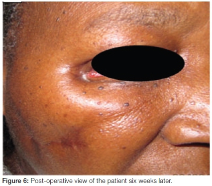 A culture swab of the inflammatory exudate demonstrated colonies of Actinomyces. The treatment plan involved surgical and medical management. The patient was surgically explored under general anesthesia. An incision was made along the pre-existent scars in the right infraorbital region along the fistula and in the region of the zygomatic buttress. This approach was used with a view to accomplishing a simultaneous scar revision. The sequestrum as well as the associated granulation tissue were removed. The cavity was burred down until healthy bone was found (Figure 5). The revised scar was approximated using resorbable sutures subcutaneously, and non-resorbable sutures were inserted on the skin. Gauze soaked in bismuth iodoform paraffin paste (BIPP) was placed into the defect intraorally and then removed after five days. The patient was discharged under antibiotic cover, which included Amoxicillin and Metronidazole, for a period of two weeks. Subsequent clinical reviews of the patient revealed complete resolution of the infection (Figure 6). Histology of the excised tissue confirmed the presence of a sequestrum associated with necrotic bone surrounded by inflamed granulation tissue.
