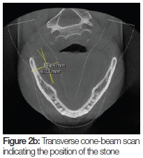 A cone-beam scan was undertaken in order to establish the size of the stone and its relative position with respect to the medial border of the mandible (Figure 2 A and B). The stone was found to measure 6.43mm in greatest diameter.