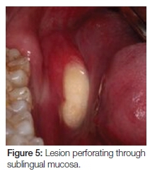 On intra-oral examination a creamy-white, bony hard lesion was visible lingual to the 47/48 region which was beginning to perforate through the sublingual mucosa (Figure 5). A preliminary diagnosis of a salivary sialolith was made.