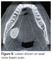 The lesion on cone-beam was seen to measure 25 x 26 mm in diameter (Figure 10). This, according to modern literature, would be considered a giant sialolith.