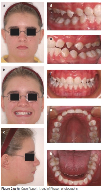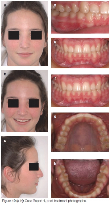 The Twin Block appliances were trimmed as the succedaneous teeth erupted and the buccal blocks were trimmed posteriorly to allow for the eruption of the first molars. The appliances were worn full time for 20,5 months followed by night time wear only for another eight months (Figures 2a-h).