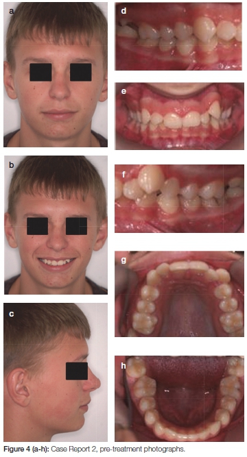 A 14-year-old male (Figures 4a-h) presented with a concern about the appearance of his upper front teeth. He presented with a Class II Division Two incisor relationship on a skeletal Class II base with a retrognathic mandible. He had a full complement of teeth with moderate crowding of the upper labial segment.