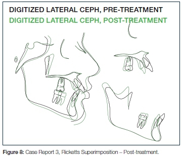 Cephalometric analysis revealed that the sagittal correction occurred due to an anterior repositioning of B point with no evidence of maxillary restraint. The upper labial segment was normalized at 22°, the lower retroclined to 20° and an interincisal angle of 138° was achieved (Figure 8).