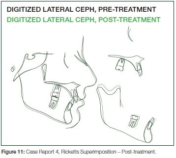Following this period of treatment, the antero-posterior correction of the buccal segments was achieved, the upper incisors had been retroclined by 8°, the lower incisors proclined by 8° and the ANB angle was reduced by 4,5°. Superimposition of cephalometric tracings revealed mandibular changes in a horizontal and vertical direction, with a favourable increase in lower anterior face height of 3.5mm (Figure 3).