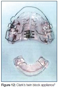 The Clark Twin Block appliance6 (Figure 12) that has been used in two of the cases presented here is a modern, highly successful functional appliance modelled after the Schwarz double plate.7 This appliance was developed more than 30 years ago by William Clark, and is composed of maxillary and mandibular removable acrylic components that fit tightly against the teeth, alveolus and adjacent supporting structures. Treatment with the appliance includes occlusal guide planes, selective grinding of the acrylic, guided eruption and a midpalatal jackscrew to allow for three-dimensional control.