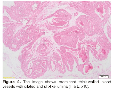 Histological examination disclosed an angiomyoma (vascular leiomyoma). The lesion consisted of prominent thick-walled blood vessels with dilated and slit-like lumina (Figure 2). Mature smooth muscle cells were arranged in bundles and whorls around blood vessels. There were also aggregates of mature adipocytes, which appeared to represent a form of degenerative metaplasia (Figure 3).