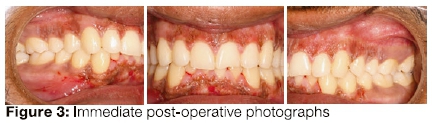 The laser tip was moved over the tissue at a clinical hand speed that allowed a tissue interaction of "gentle" sloughing of the surface tissue. The power setting of the laser was adjusted based on the preferred hand speed of the clinician and in order to achieve the clinically visible level of sloughing. This entire process of depigmentation for both the upper and lower arches took approximately 20 minutes. The immediate post-operative result is illustrated in Figure 3.