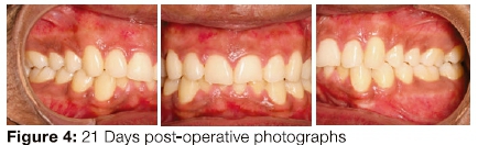 The reported advantages of laser depigmentation include easy clinical application, short treatment time, easy gingival reshaping, haemostasis, negligible post-operative pain and elimination of the need for a periodontal dressing. Disadvantages of laser surgery Include delayed type of inflammatory reaction, which may take place with mild post-operative discomfort lasting up to 1-2 weeks. Re-epithelialization is delayed due to lack of wound contraction when compared with conventional surgery.11,24