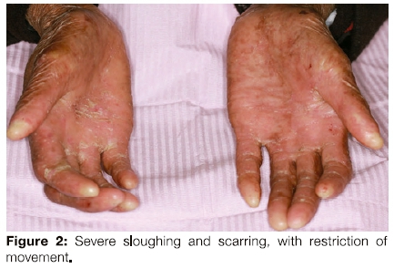 The extra oral examination revealed extensive sloughing of the skin of the hands, chest and back. The hands showed atrophic scarring, skin fragility and nail loss on numerous fingers, which also demonstrated restricted movement (Figures 1, 2).