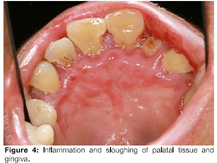 The patient had limited mouth opening because of scarring related to repeated episodes of ulceration (Figure 3) and poor oral hygiene. Her gingiva was inflamed (Figure 4). The middle to anterior dorsal surface of her tongue was atrophic, smooth and erythematous, while the posterior dorsal tongue had white yellowish plaques (Figure 5). The orthopantomogram demonstrated multiple carious teeth with generalised, severe horizontal boneloss (Figure 6).