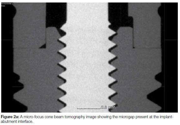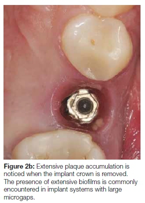 Proposed criteria of acceptable bone loss of 1.5 mm during the first year of loading, and 0.2 mm annually thereafter, are still widely accepted by the scientific community.16 Significant changes in implant treatment protocols have occurred, ranging from using machined-surfaced implants and mainly restoring the edentulous jaw, to current protocols involving surface-enhanced implants restoring single missing teeth. Many other non-infectious factors may also contribute to early bone loss. The reader is referred to a published article for a more comprehensive review on this topic.25 The amount of bone remodeling depends on implant hardware, surgical technique, prosthesis design, and patient factors.16,25 The presence or absence of a dental implant-abutment interface that may harbor bacteria plays an important role in peri-implant health. A chronic presence of inflammatory-cell infiltrate is found whenever a micro-gap is present (Figures 2a and 2b).20 Histological differences exist between periodontitis- and peri-implantitis lesions.