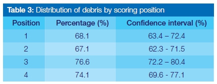 Table 3 represents the distribution of debris as a percentage found in each assigned scoring position. Inter-examiner agreement was found to be fair in scoring position 2 and moderate over the other scoring positions, as assessed using a simple Kappa test (0.41, 0.39, 0.41, and 0.52 for positions 1 to 4, respectively).
