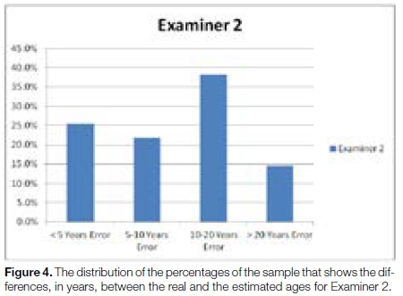 Using the Student's t-test and p-value30, 31 to compare the mean differences between the estimated ages and real ages as found by Examiners 1 and 2, it was established that there was not a statistically significant difference between the results found by Examiners 1 and 2, the p-value being greater than 0.05.