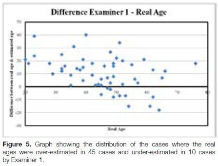 The results showed that Examiner 1 and Examiner 2 over-estimated the ages of 45 of the 55 individuals. All the cases where the ages were under-estimated were of individuals who were over 45 years of age.