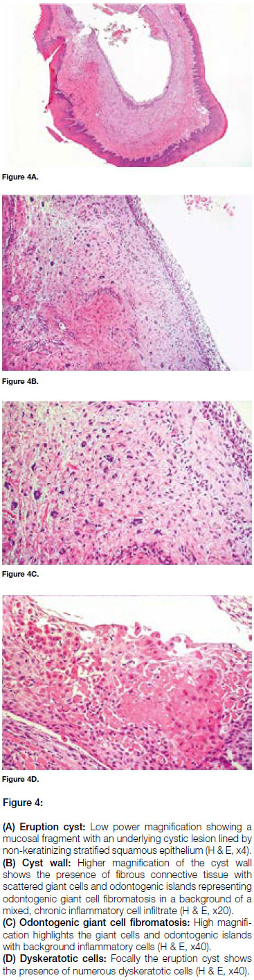 Histological analysis confirmed the diagnosis of multiple eruption cysts with the presence of odontogenic giant cell fibromatosis in the overlying mucosa. The lesions showed the presence of odontogenic epithelial islands with scattered giant cells and histiocytes in a surrounding dense fibrous connective tissue stroma. Occasional dyskeratotic cells were seen, which were more abundant in one fragment, and a mild, chronic inflammatory cell infiltrate was present within the surrounding fibrous connective tissue (Figures 4A to D).