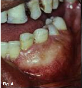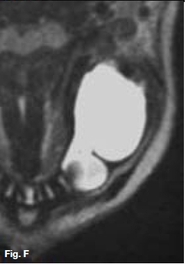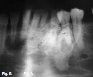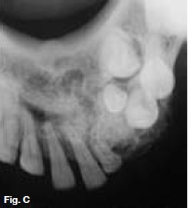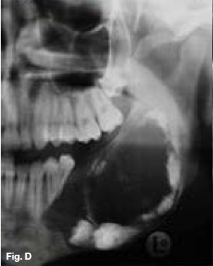 The cropped pantomograph (Fig.B) shows a multilocular radiolucency of an expansive tumour containing varying calcifications. Figures D&E show a well demarcated multilocular lesion in the body/ramus region of the left mandible, with two displaced molar teeth, resorption of the roots of 34 and 35 and tooth-like calcifications at the borders of the lesion. The coronal T2 MRI image (Fig.F) shows a multilocular hyper-intense lesion, with no discernible calcifications. Diagnosis: the rare tumour, odonto-ameloblastoma (OA), first reported by Kemper and Root (1944). Shafer ef al (1983) described this as an odontogenic neoplasm of mixed tissue origin, consistent with both ameloblastoma and odontoma. Histologically, a typical ameloblastoma component whilst the odontoma element may be either compound or complex. Shafer et al (1983) emphasized that this is one neoplastic process with relatively highly undifferentiated tissues. Occurring most commonly in the second decade of life, it may vary in size. Smaller lesions occur between the teeth, confined to the alveolar bone between the crest of the ridge and the teeth apices (Figs. A,B&C). Buccal expansion of the cortex is common, even for smaller lesions. The odontoma component presents various stages of development, early lesions being radiolucent with radiopaque flecks. More mature lesions are better developed odontoma, resembling teeth or as a nonspecific complex odontoma mass. Importantly, this is an aggressive tumour, treated precisely as an ameloblastoma. The differential diagnosis should include: ameloblastic fibro-odontoma, Pinborg tumour, calcifying odontogenic cyst and adenomatoid odontogenic tumour.