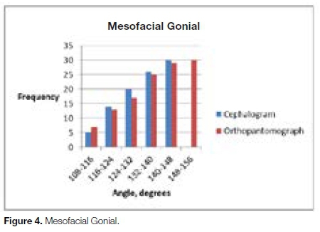 • The mean as well as the median values of the gonial angles from the lateral cephalogram and orthopantomograph do not differ significantly.