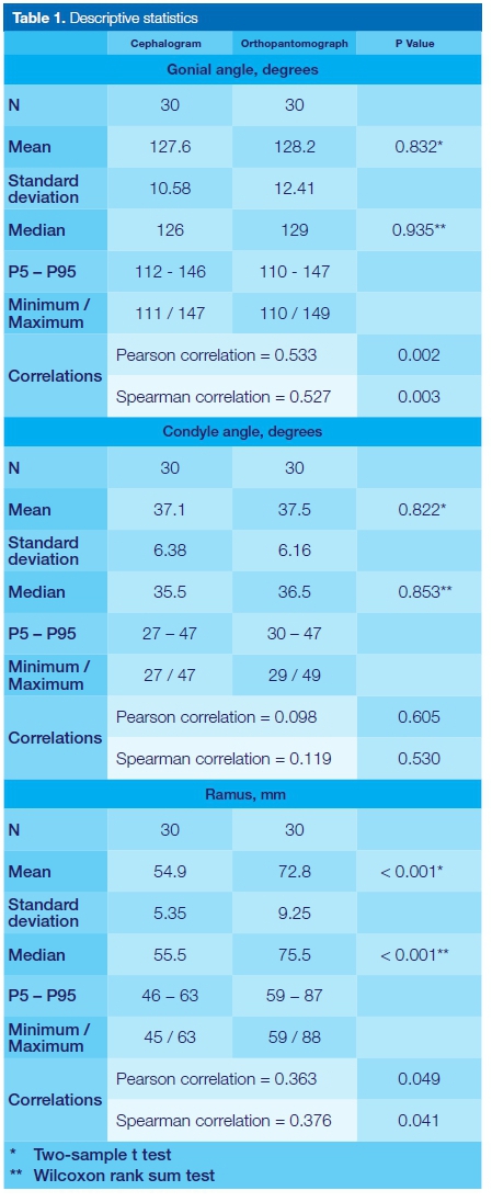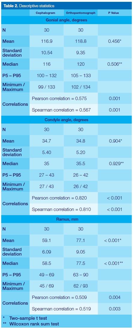 • The P5 - P95 intervals do not match closely for C Ramus and O Ramus, in contrast to the overlap between the lateral cephalogram and orthopantomograph bars for the gonial and condyle angles. Thus, significant and positive correlations between the data from the two radiographs were found for the gonial angles and the condyle angles. With regards the ramus measurements, no correlation was found.