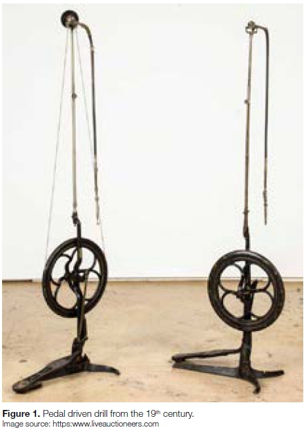 Mechanical drills such as used in woodwork were in favour in the 18th century in Europe, whilst a clockwork drill was invented by George Harrington in 1864 ...somewhat faster but noisy... and called Erado! Pneumatic drills operated by foot activated bellows followed, and the pedal driven drill arrived in Dentistry in 1871 (James Morrison, inventor).