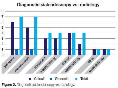 Sialendoscopy found pathology in all the cases investigated with sialograms. In one case ultrasound showed a false positive as sialendoscopy did not find a calculus as had been indicated by the ultrasound.
