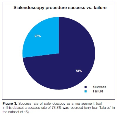 The success rate in this study was 73.3%. The cases that were considered failures were due to excessive bleeding, abscess formation and failure of calculus retrieval. Despite our small sample size, it appears that sialendoscopy offers good outcomes for both the diagnosis and the treatment of the majority of cases of salivary ductal obstruction and that it is the gold standard for the first line management of this pathology.