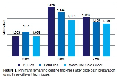 Figure 2 illustrates the minimum remaining dentine thickness after final preparation with the WaveOne Gold Primary instrument in combination with the different glide path/no glide path preparation techniques.