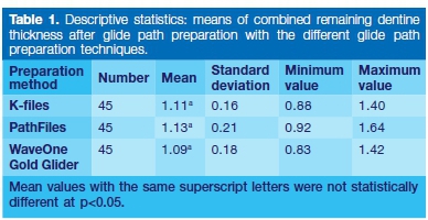 Mean and standard deviations were determined for each group and analysis of variance was used to statistically compare the mean remaining dentine thicknesses after glide path and again after final preparation with the Primary WaveOne Gold between the different preparation groups.