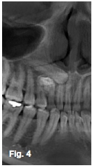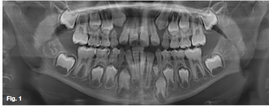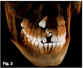 The pantomograph (Figure 1) shows an incidental radio-paque mass in the 3rd quadrant. 3D MIP (Figure 2) and a sagittal CBCT slice (Figure 3) indicates an impaction of the maxillary central incisor. A reconstructed PAN (Figure 4) demonstrates a retained 53. With intraoral radiographs (Figure 5 and 6) demonstrating multiple miniature tooth-like structures. These are characteristic representations of compound odontomas.