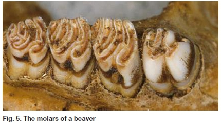 Plant cell walls are mainly cellulose, which we have great difficulty in digesting, but herbivores have a physiology and gut bacteria that can breakdown cellulose to produce energy. To release the cellulose, you have to really grind that material up; and to do that, you need teeth that are really rough. But mammalian teeth are enamel on dentine, held in a ligament by cementum, as you know. So to evolve a rough surface, it makes sense to take advantage of the fact that each of these materials wear down at a different rate. So when they wear, some will wear more than others, and it further makes sense to make lots of cusps that can wear. Fig. 4 is an example. It is the just erupted last molar of a porcupine, and next to it is one that has erupted, the cusps of which have worn down. Fig. 5 is another example, of the 4 molars of a beaver, with the last one recently erupted and showing early wear.