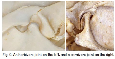 Fig. 9 is the joint of a herbivore on the left (a Rock Hyrax, or Dassie), and of a carnivore on the right (a Lynx). Note the complete freedom the herbivore's joint allows for free movement of the mandible, especially sideways, and contrast this with the restriction of the carnivore's joint to a purely hinge movement by virtue of the flanges on both the condyle and the fossa. No chewing is possible, which makes them messy eaters but efficient ones.