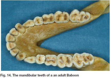 So if you want to get to the top of the food chain, then you need to be able to eat everything! Omnivore is derived from the Latin omnis, meaning 'all or everything' and vorare, meaning 'to devour or eat'. So now you need a physiology that can cope with plants and meat, and you need teeth that can bite, cut, and chew. And depending on how easy or not it is to get the meat, you may still need pretty good canines, unless you can evolve intelligently enough to use tools to do the job of hunting and catching, in which case you may not need them. The latter is us, the former is the primates, our close cousins. So while our posterior teeth may look the same, our canines certainly don't! Fig. 12 shows the posterior teeth of chimpanzee. Look familiar? But if you look at the entire dentition, the canines are, well, different (Fig. 13). These are the teeth of a young chimpanzee, whose posterior teeth are not fully erupted and still have all their cusps. They look remarkably like modern human teeth, and in fact they are no different. But now look at the teeth of an adult primate, this time a Baboon (Fig. 14).