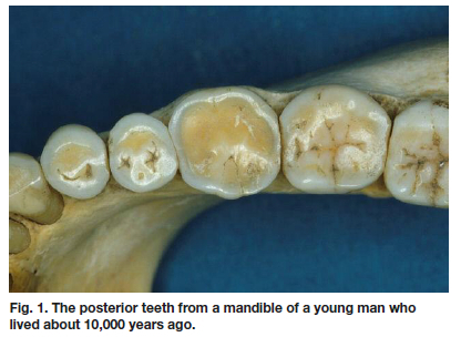 To work out how it all happens, we have to go back to how our teeth functioned whilst they were wearing down under natural conditions of eating unrefined, coarse and abrasive food. We first started with cusps, which helped guide the teeth to contact the opposing arch, because of two forces: a continuous eruption force, and a mesial vector of force which directs the eruptive force forwards. Both the eruptive force and alveolar bone growth continue throughout life, which may explain why our faces get longer if we don't wear our teeth down. 1 Natural (pre-refined foods) dentitions, such as in Fig. 1, show occlusal wear, but also, because of the mesial force vector, interproximal wear.