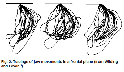 These patterns have been shown graphically by tracing either a point of light attached to the lower incisors, or electronically by tracing a magnet attached there.3 And they confirm that, the omnivores that we are, our mandibles have vertical and horizontal phases, closing mostly on one side, and then opening by moving to the other side. Fig. 2 shows tracings of jaw movements made by the same subject from three separate occasions in a frontal plane while chewing on the right side.